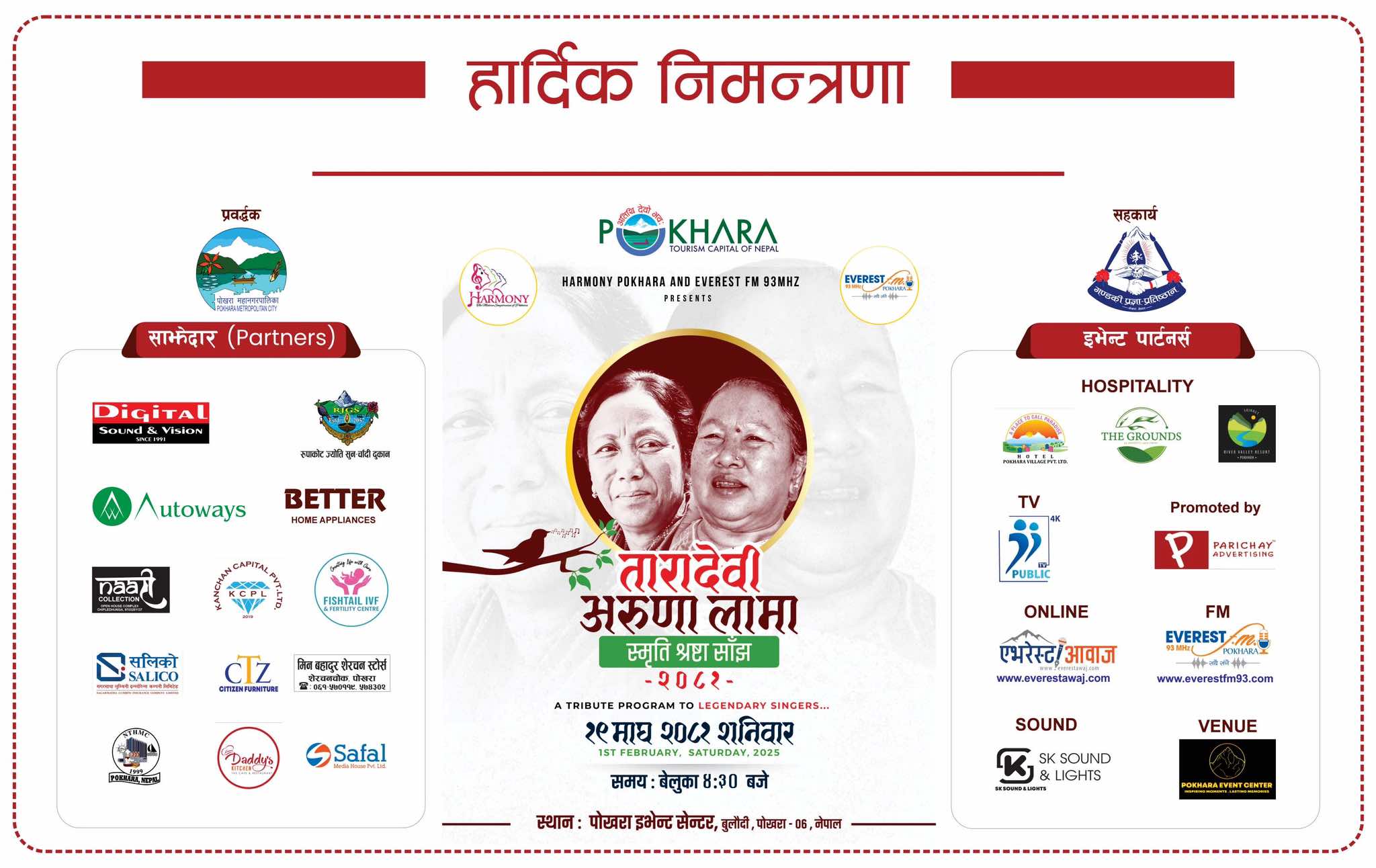 पोखरामा आउँदो शनिबार अरुणा लामा–तारादेवी स्मृति श्रष्टा साँझको तेश्रो संस्करण हुने भएको छ । पोखरेली महिला कलाकारहरुको साझा संस्था हार्मोनी र एभरेस्ट एफएम ९३ मेगाहर्जको संयुक्त आयोजनामा यहि माघ १९ गते शनिबार पोखराको बुलौंदीस्थित पोखरा इभेन्ट सेन्टरमा अरुणा लामा–तारादेवी स्मृति श्रष्टा साँझको तेश्रो संस्करण हुने भएको हो ।
