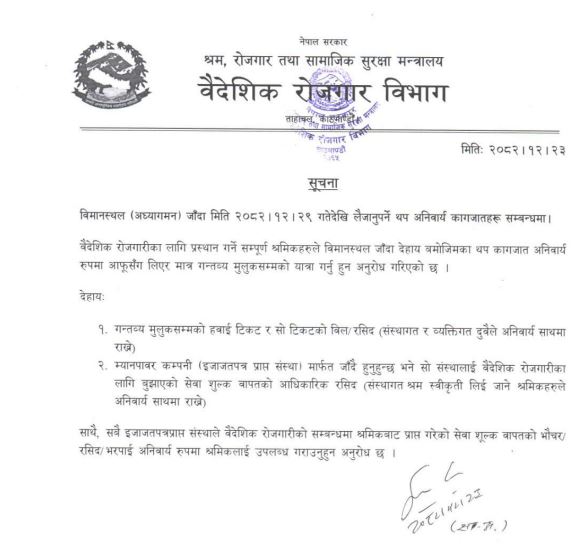 वैदेशिक रोजगार विभागले विज्ञप्ति निकालेर आउँदो चैत २९ गतेदेखि हवाई टिकट र टिकटको बिल र म्यानपावर कम्पनीमार्फत जाने भए बुझाएको सेवा शुल्क बापतको आधिकारिक रसिद राख्न अनुरोध गरेको हो ।