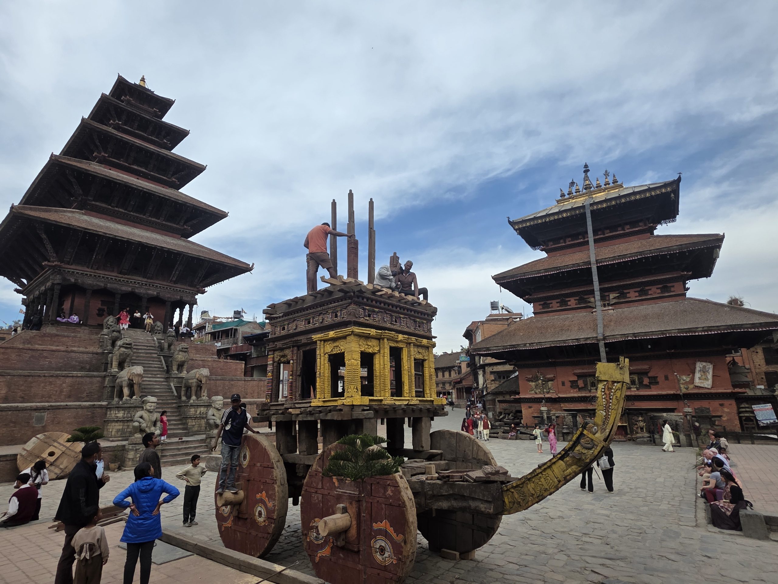 टौमढीस्थित पाँचतले मन्दिर प्राङ्गनमा प्यागोडा शैलीको तीन तले रथ निर्माण कार्य तीव्र गतिमा भइरहेकोे गुठी संस्थान भक्तपुरका प्रमुख आनन्दप्रसाद कर्माचार्यले जानकारी दिनुभयो । उहाँले भैरवको रथ निर्माण सम्पन्न भए लगत्तै भद्र्रकालीको रथ निर्माण सुरु गरिने जानकारी दिँदै अहिलेसम्म भैरव रथ निर्माणको क्रममा विभिन्न आकारका काठ तयार गर्ने, पाङ्ग्राहरु जोड्ने, बिग्रिएका सामानको मर्मत गर्ने, भाँचिएका धुराहरु मर्मत गर्ने, चुकुलहरु फेर्ने, नयाँ आसी जडान गर्ने, छानो मर्मत गर्ने र रथ निर्माण गर्ने कार्य तीव्र गतिमा भइरहेको बताउनुभयो ।