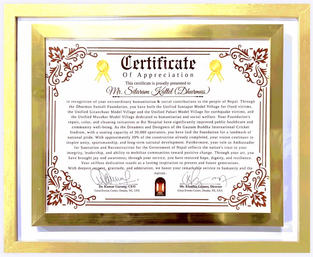 हास्यकलाकारद्वय सीताराम कट्टेल (धुर्मुस) र कुञ्जना घिमिरे (सुन्तली) अमेरिकामा सम्मानित भएका छन्। नेब्रास्का राज्यको ओमाहा सहरस्थित ग्रेट इभेन्ट्स सेन्टरद्वारा आयोजित कार्यक्रममा उनीहरूलाई कलाकारिता र समाजसेवामा पुर्याएको योगदानको कदर गर्दै सम्मान प्रदान गरिएको हो।