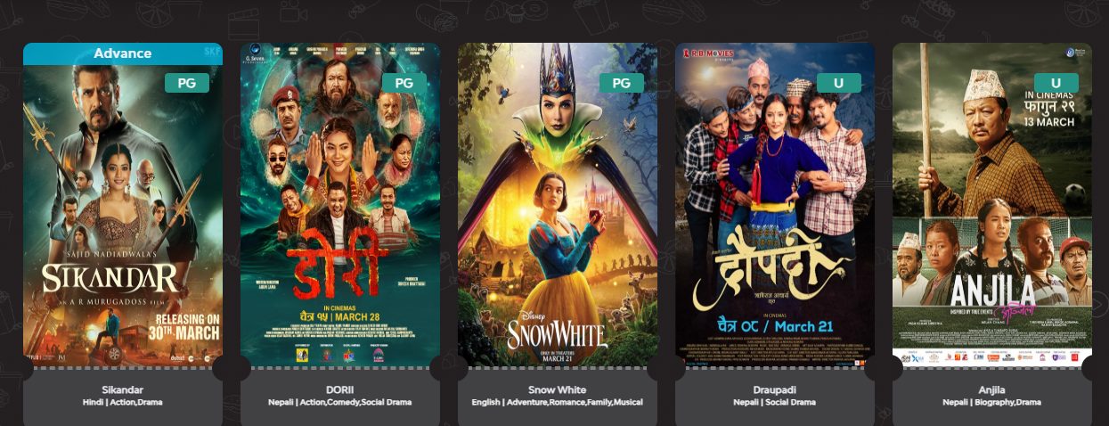 यसअघि हलमा लागेका फिल्म ‘लाज शरणम्’,‘अञ्जिला’,‘होस्टेल ३’,‘द्रोपती’,‘आउट ल : दफा २१९’,‘राजागञ्ज’का साथै बलिउड अभिनेता सलमान खान अभिनित ‘सिकन्दर’हलमा चलिरहेको छ। यो बाहेक अन्य फिल्म पनि प्रदर्शनमा रहेका छन्।