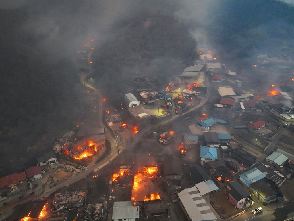 दक्षिण कोरियाको सबैभन्दा खराब मध्येको तीव्र हावाका कारण फैलिएको डढेलोले देशको दक्षिणी क्षेत्रहरूलाई ध्वस्त पारेको छ।