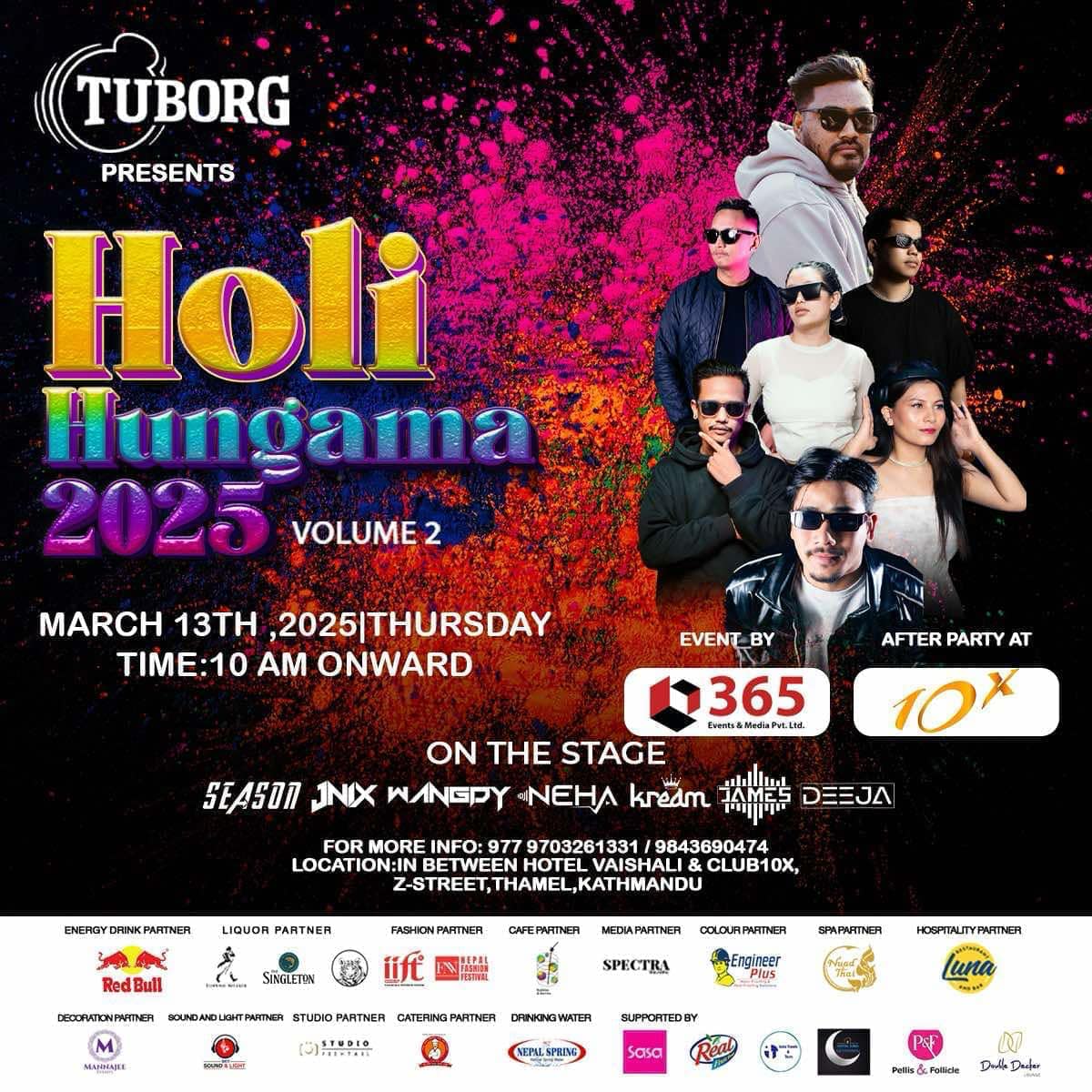काठमाडौं : यस वर्ष पनि रंगहरूको चाँड होलीको अवसरमा ठमेलमा होली हंगामा ‘सिजन टु’ हुने भएको छ । बिहीबार थ्री सिक्स्टी फाइभको इभेन्टको आयोजनामा ठमेलको होटल वैशाली अगाडि तथा टेन एक्सको पार्किङ जेड स्ट्रीटमा विभिन्न कलाकारको प्रस्तुतीसहित होली हंगामा हुने भएको हो ।