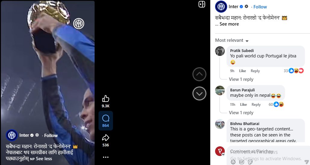 इन्टर मिलानले सार्वजनिक गरेको भिडियोमा नेपाली गीतको एक अंश बजाइएको छ भने क्याप्सनमा लेखिएको छ, ‘सबैभन्दा महान : रोनाल्डो द फेनोमेनन । नेपालबाट थप सामग्रीका लागि हामीलाई पछ्याउनुहोस् ।’ विश्वविख्यात क्लबले नेपाली भाषा र गीत प्रयोग गर्नु आफैंमा दुर्लभ घटना मानिएको छ।