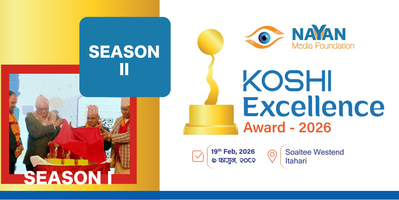 यो अवार्ड गतशाल नयन एड्भरटाइजिङ मिडिया प्रालिद्वारा सञ्चालित हुँदै आएको थियो। तर यस वर्षदेखि नवनिर्मित नयन मिडिया फाउन्डेशनमार्फत कार्यक्रम आयोजना हुने फाउन्डेसनका अध्यक्ष पवन अधिकारीले जारी गरेको विज्ञप्तिमा उल्लेख छ। अध्यक्ष अधिकारीले जारी गरेको विज्ञप्तिमा भनिएको छ– “हामीले अवार्डको संरचना, विधा विस्तार, निर्णायक छनोट प्रक्रिया र समग्र व्यवस्थापनलाई अझ बढी व्यवस्थित, पारदर्शी र मर्यादित बनाएका छौँ । यो अब कोशीको मात्र नभई नेपालकै प्रतिष्ठित अवार्ड बन्नेछ ।”