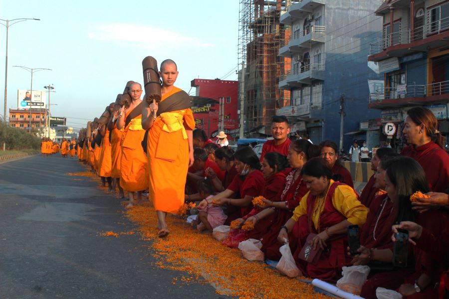 भैरहवा : पाँच सय जना श्रामणेर (अल्पकालीन भिक्षु) हरूको यात्रा ‘धम्म यात्रा’ शनिबार सम्पन्न भएको छ । भैरहवाको सिद्धार्थ रङ्गशालाबाट सुरु भएको धम्म यात्रा देवकोटा चोक, बैंकरोड, नारायणपथ हुँदै लुम्बिनी गेटमा समापन भएको थियो । लुम्बिनी गेटमा हजारभन्दा बढी स्थानीयले श्रामणेरहरूको स्वागतमा उनीहरूको पाऊमुनि फूल छरेर स्वागत गरेका छन् ।
