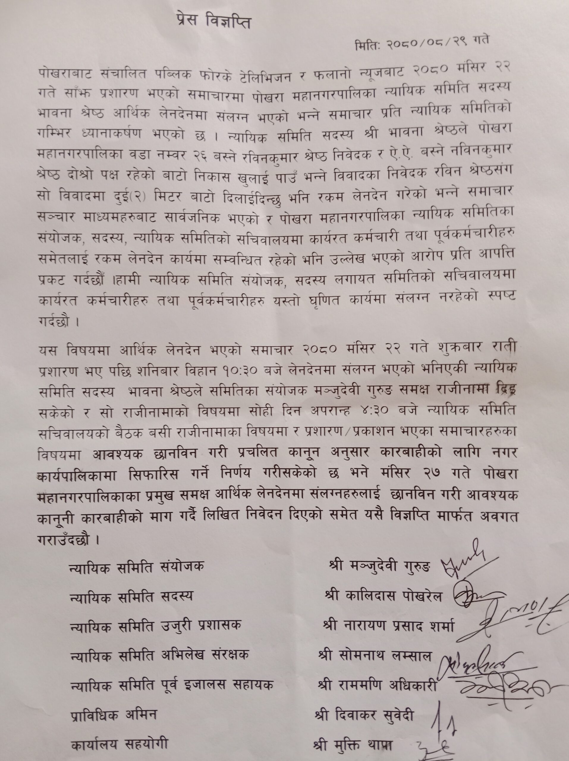 यस्तै न्यायिक समिति संयोजक, सदस्य, समितिको सचिवालयमा कार्यरत कर्मचारीले संयुक्त रुपमा मंसिर २७ गते पोखरा महानगरपालिकाका प्रमुुख समक्ष आर्थिक लेनदेनमा संलग्नहरुलाई छानविन गरी आवश्यक कानुूनी कारबाहीको माग गर्दै लिखित निवेदन दिएको समेत विज्ञप्ति मार्फत जानकारी गराइएको छ । विज्ञप्तिमा न्यायिक समिति संयोजक मञ्जुुदेवी गुुरुङ, न्यायिक समिति सदस्य कालिदास पोखरेल, न्यायिक समिति उजुरी प्रशासक नारायण प्रसाद शर्मा,न्यायिक समिति अभिलेख संरक्षक, सोमनाथ लम्साल, न्यायिक समिति पूर्व इजालस सहायक राममणि अधिकारी, प्राविधिक अमिन दिवाकर सुुवेदी, कार्यालय सहयोगी मुक्ति थापाले हस्ताक्षर गरेका छन् ।