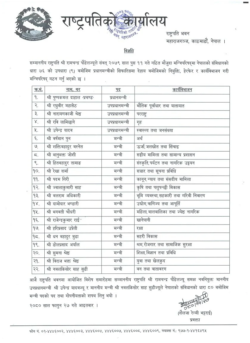 प्रचण्ड नेतृत्वको मन्त्रिपरिषद‍्मा चार जना उपप्रधानमन्त्री