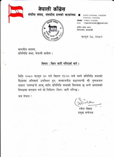 सोमबार कांग्रेस संसदीय दलका प्रमुख सचेतक रमेश लेखकले सबै सांसदहरूका नाममा पत्र लेख्दै प्रधानमन्त्री प्रचण्डको विश्वासको मतको विपक्षमा मतदानका लागि ह्विप जारी गरिएको जानकारी दिएका हुन्।