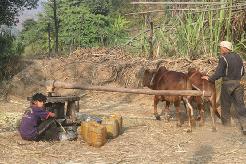 यहाँका किसानले उखु बेच्दैनन्, त्यसलाई पेलेर सक्खर बनाएपछि मात्रै बजारमा पठाउँछन् । यहाँ विसं २०३८ मा स्थानीय किसानहरू मिलेर खरिद गरेको फलामे मेसिन छ । यही मेसिनमा हल गोरुको सहारामा उखु पेल्छन् । त्यसबाट निस्केको रस ठूलो फलामे कराहीमा पकाएर सखर बनाउँछन् । अचेल यस्तै काममा व्यस्त छन् यहाँका किसान ।
