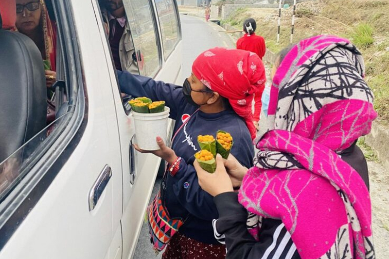 काँडेकी मनमाया विकले वनपाखा पुगेर ल्याएको ऐँसेलुलाई मल्लाताको हरियो पातमा बेरेर बेच्ने गरेको सुनाइन् ।बिहानमा ऐँसेलु टिप्ने र दिउँसो राजमार्गमा ल्याएर बेच्ने गरेको उनले बताइन् ।