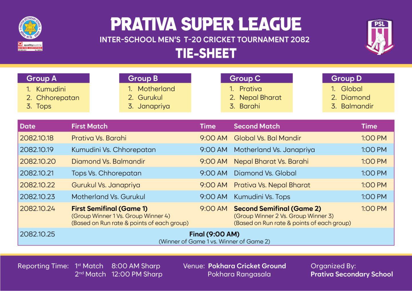 लिग कम नकआउटका आधारमा हुने प्रतियोगिताको समूह ‘ए’ मा कुमुदिनी होम्स, छोरेपाटन मावि र टप्स मावि, समूह ‘बी’ मा जनप्रिय मावि, गुरुकुल विद्यासदन र मदरल्याण्ड मावि, समूह ‘सी’ मा आयोजक प्रतिभा माविसहित नेपाल भारत मैत्री विद्यालय र वाराही मावि मालेपाटन तथा समूह ‘डी’ मा ग्लोबल कलेजियट स्कुल, डायमण्ड मावि र बालमन्दिर मावि रहेका छन् ।